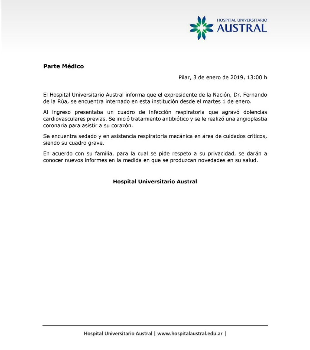 El Hospital comunicó que De la Rúa, en su ingreso, presentaba "un cuadro de infección respiratoria que agravó dolencias cardiovasculares previas" y que en consecuencia "se inició tratamiento antibiótico y se le realizó una angioplastia coronaria para asistir a su corazón". Actualmente el expresidente está sedado y en asistencia respiratoria mecánica en área de cuidados críticos. Su cuadro sigue siendo grave.