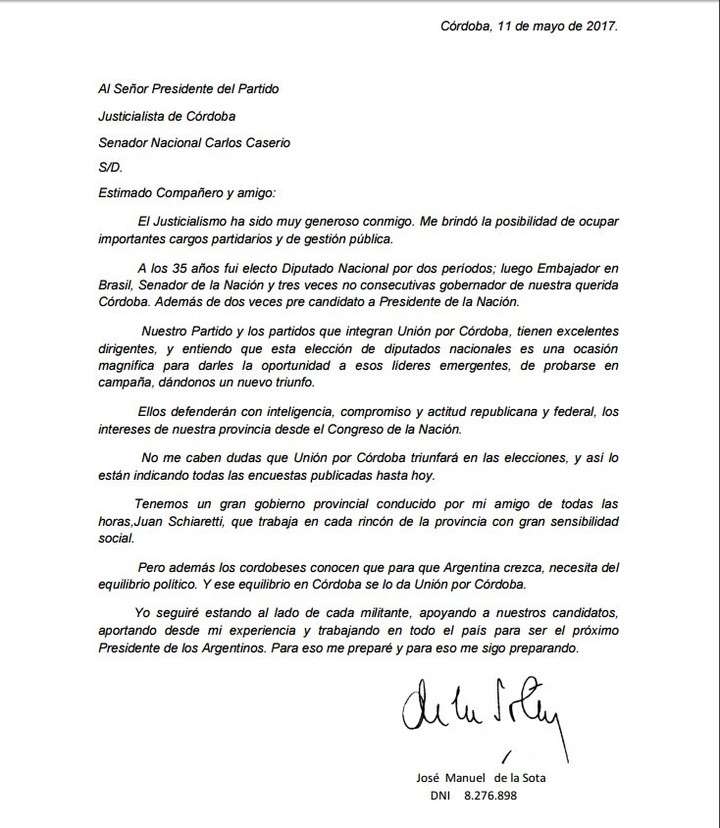 “Ya tuve el honor de servir a mi país como legislador: fui diputado a los 35 años y senador a los 46. Fui, gracias a la confianza de los cordobeses, tres veces gobernador de Córdoba. Sólo me falta ser presidente de la Nación y para eso me preparé, me sigo preparando y trabajo cada día”, escribió el exgobernador en su carta al partido.