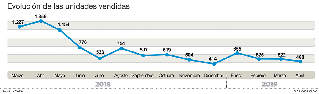 A nivel nacional, las ventas de autos cayeron un 52% respecto del 2018. En abril del año pasado se patentaron 77.601, lo que ya representaba una caída en la industria. Sin embargo, durante el cuarto mes de 2019 los patentamientos alcanzaron la suma de 33.527 vehículos. Además, hay un descenso del 4,8% respecto de marzo de este año.