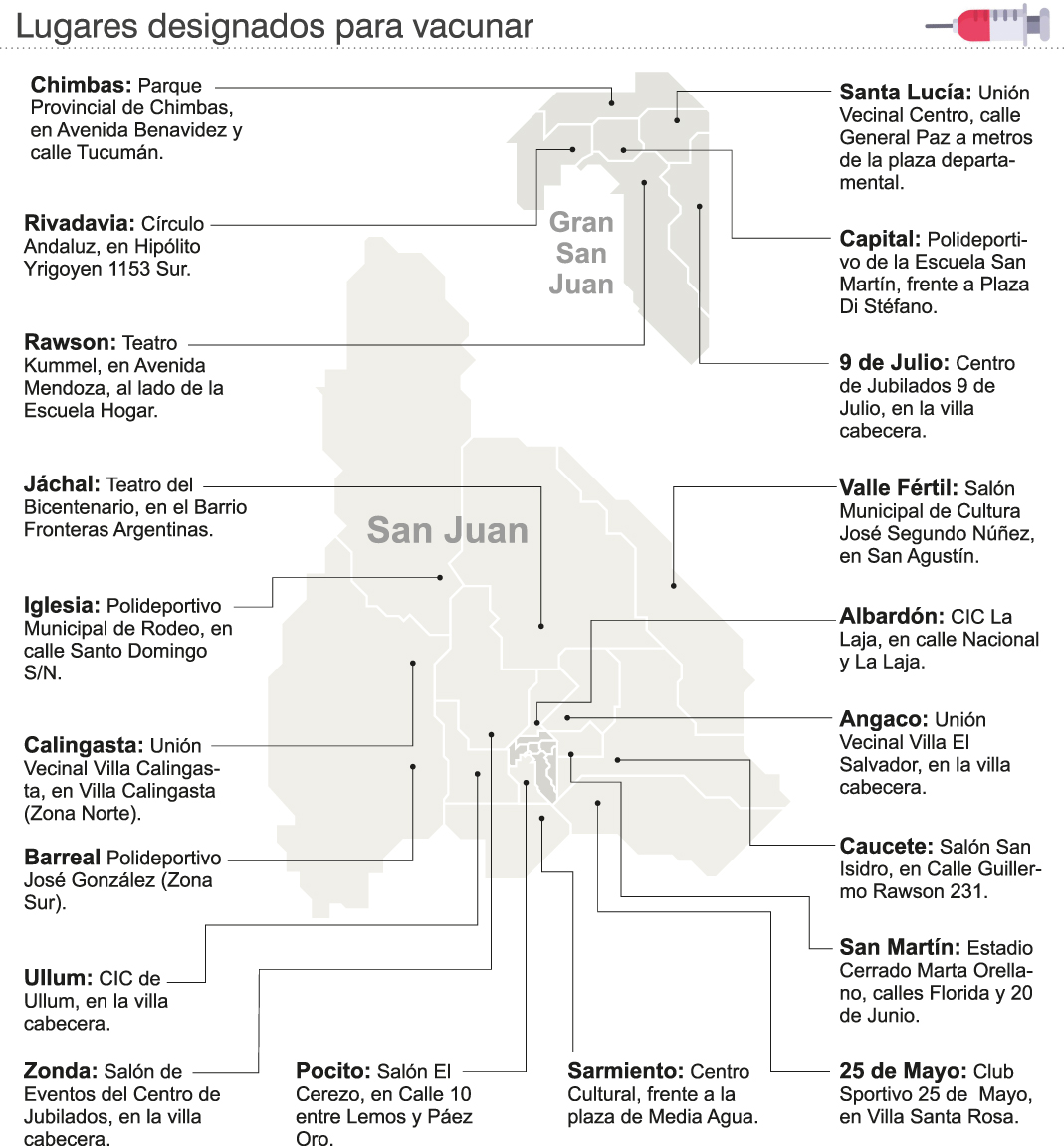 En una tarea contrarreloj, Salud Pública y los municipios de los 19 departamentos ayer designaron los lugares para vacunar a los adultos mayores. Muchos municipios eligieron sus estadios o polideportivos para que se conviertan en vacunatorios, como es el caso de Iglesia, San Martín y 25 de Mayo, mientras que otros apostaron a espacios verdes como Chimbas o los teatros o salones culturales como Rawson y Sarmiento. Cada comuna buscó sitios que resulten relativamente cercanos a los vecinos y que cumplan con todas las condiciones para llevar a cabo esta actividad sin riesgo. (Ver infografía).