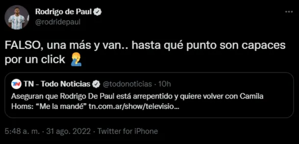 Pero tras darse a conocer la noticia, el mismo Rodrigo De Paul volvió a utilizar Twitter para aclarar la situación, tal cual había sucedido hace unas semanas atrás con el episodio que protagonizó dentro de la cancha con Giovanni Lo Celso en pleno partido.