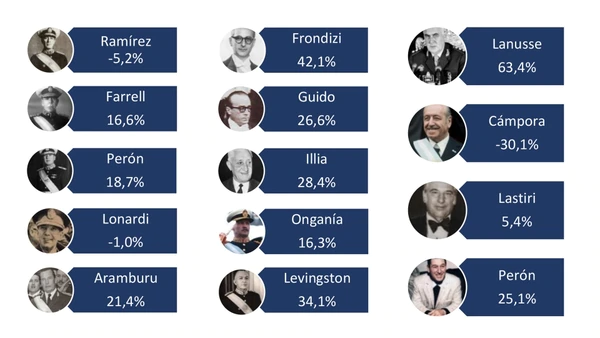 Desde el primer dato oficial de precios al consumidor en enero de 1943 hasta la muerte de Perón, en julio de 1974, fueron 14 los presidentes argentinos (constitucionales y de facto). La mayor variación interanual de precios durante este período se registró a mediados de 1959 bajo la presidencia de Arturo Frondizi, con una tasa de inflación que superó el 120%. Sin embargo, el presidente que experimentó una mayor tasa de inflación promedio durante su período de gobierno fue el presidente de facto Alejandro Lanusse, con un 63,4% de inflación anualizada en sus poco más de dos años en el poder, de acuerdo al relevamiento de la CAC.