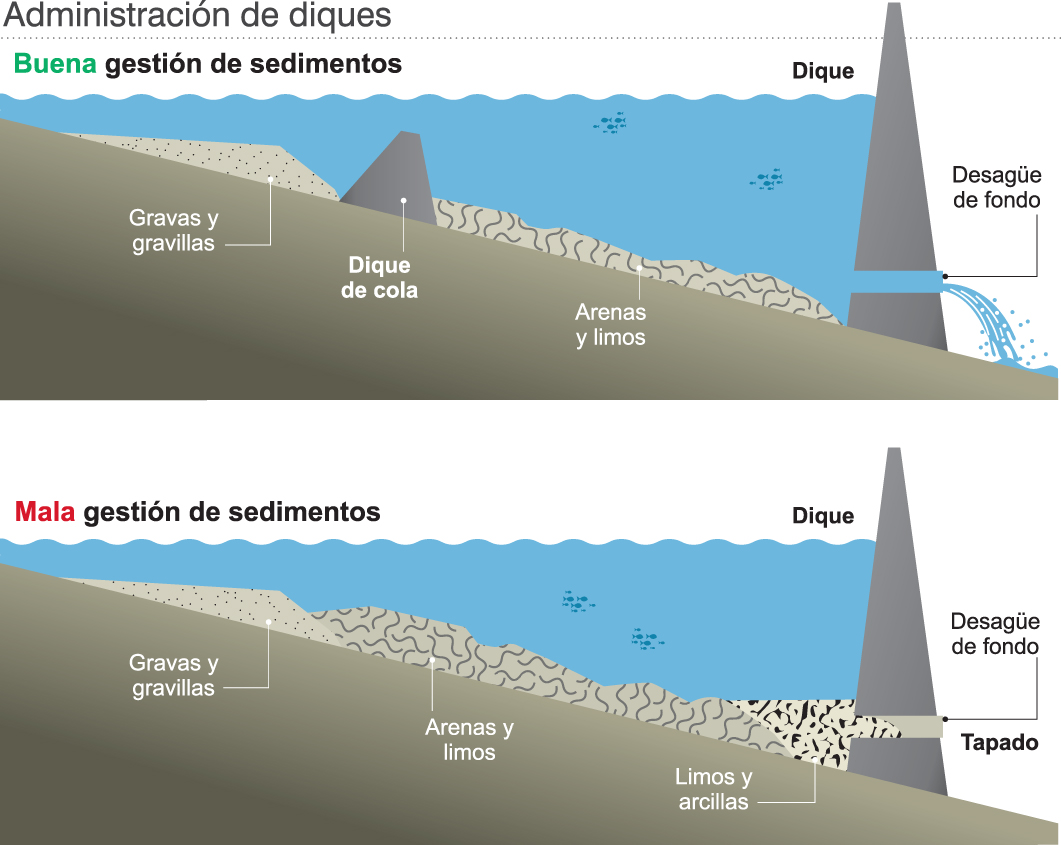 Finalmente alerta: "Una de las normas básicas de seguridad es el no sobrepasar niveles máximos ni vaciar las presas por debajo de sus niveles mínimos. El problema principal de los niveles mínimos en los embalses es el asociado a los sedimentos. El material de arrastre sólido de los ríos generalmente se deposita en la cola de los embalses y si bajamos el nivel de agua en los mismos generamos corrientes de densidad que logran la capacidad de arrastre y sustentación de los sedimentos que pueden llegar hasta las obras de toma colmatándolas".