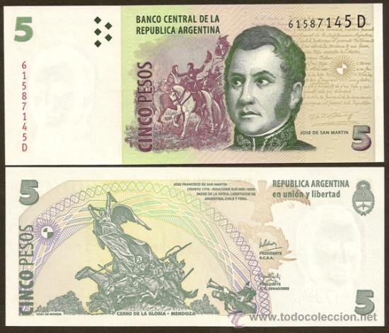 Al tratarse del billete de menor denominación, el papel de 5 pesos sufre un deterioro más veloz que el resto de los billetes. Actualmente, circulan 510,6 millones de unidades de este billete, con la imagen del General José de San Martín en su anverso, que se emitió a partir de 1998, dijo la autoridad monetaria en un comunicado.