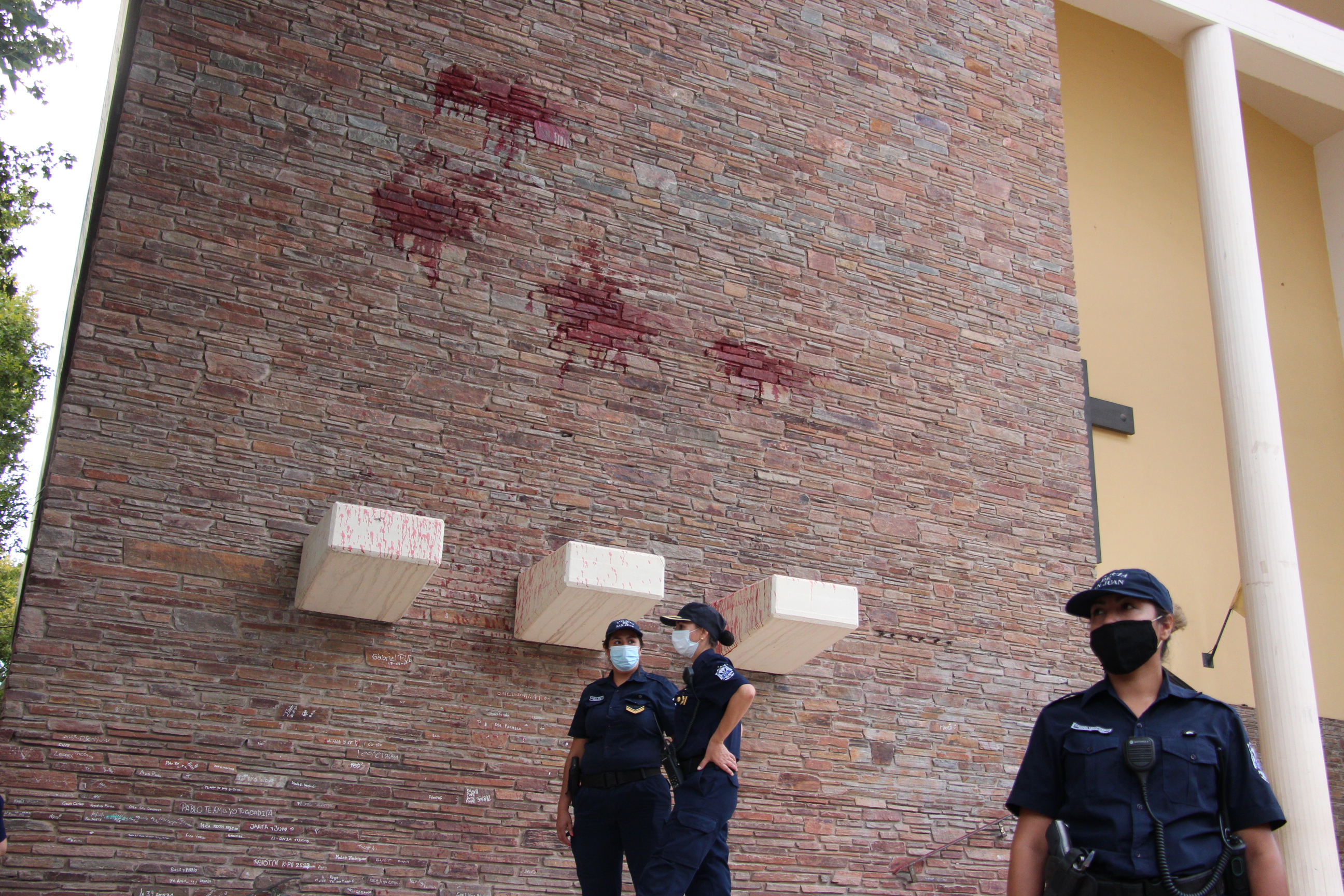 El camino de la manifestación continuó por avenida Ignacio de la Roza y al aproximarse a la Catedral, un grupo de chicas pintaron con rojo el frente de la iglesia.
