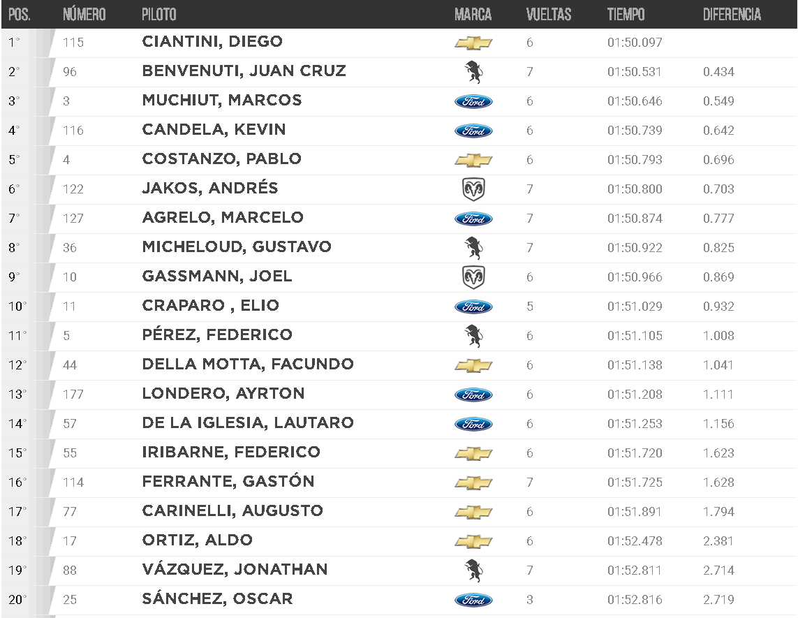 El piloto sanjuanino, que corre con un Chevrolet del equipos Las Toscas, mantuvo la posición de largada durante casi toda la carrera que sirvió para armar la grilla de mañana a las 11:50.