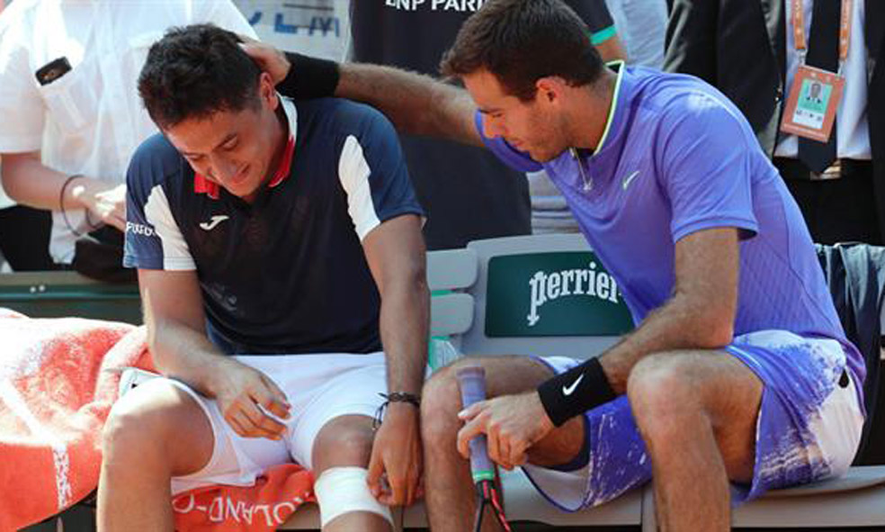 Del Potro fue el único argentino que logró avanzar en el polvo de ladrillo de Bois de Boulogne, ya que más tarde Renzo Olivo y Nicolás Kicker cayeron frente a Kyle Edmund y Pablo Cuevas, respectivamente. El partido entre Del Potro, 30 en el ránking de la ATP, y Almagro (69) estaba 6-3, 3-6 y 1-1 cuando el español debió retirarse por una lesión en la rodilla. El argentino, que conoce como pocos la frustración que generan las lesiones, consoló a Almagro y lo acompañó hasta que dejó la cancha.