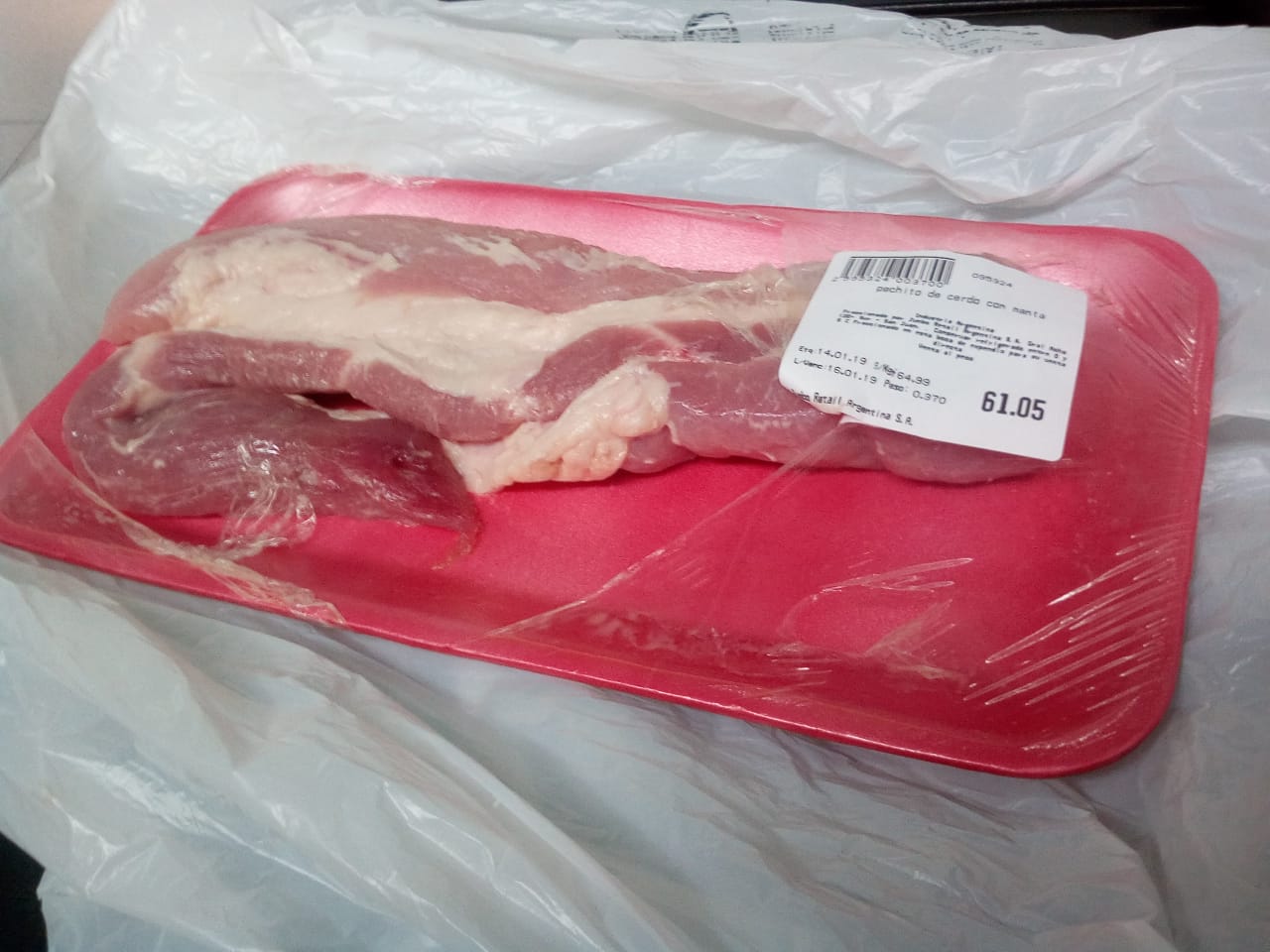Se presentó con un corte de pechito de cerdo, recientemente adquirido, que emanaba olores nauseabundos y tenía una textura viscosa. La mujer asegura haber realizado el reclamo ante el gerente de la empresa pero que no le dio ninguna respuesta favorable y recibió un pésimo trato.