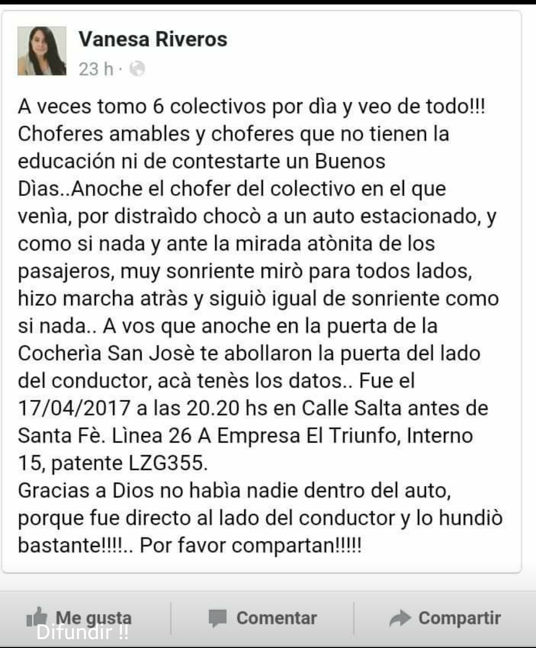 Una mujer relató en su Facebook una insólita situación en la que fue testigo directo. Según cuenta en la publicación, el pasado lunes 17 de abril a las 20.20, un colectivo de la línea 26 de El Triunfo impactó a un auto que estaba estacionado en calle Salta antes de Santa Fe. "Lo hundió bastante", acotó, y explicó que el golpe fue en la puerta del lado del conductor.