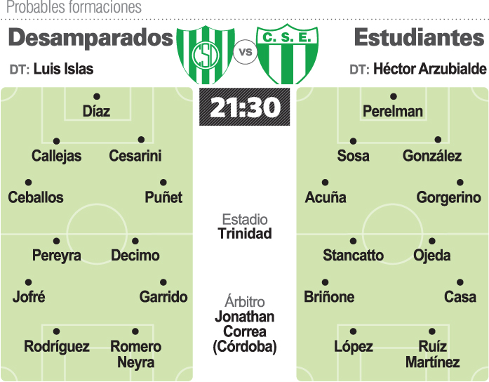 Para Sportivo Desamparados, todo empieza a ser ayer. Es que urgido por mejorar su puntaje, encontrar su perfil futbolístico y lograr la primera victoria del ciclo de Luis Islas al frente del plantel puyutano, hoy desde las 21,30 y en el Barrio Atlético, Sportivo será local de Estudiantes de San Luis abriendo la fecha 10 de la Zona A del Torneo Federal A. Esa es la urgencia que gobierna el día a día en Desamparados que con un golpe de timón que incluirá tres cambios, hoy irá por esa victoria que le permita despegar de una buena vez en una temporada que se le complica. En el arco, la presencia de Jairo Díaz por Alan Minaglia es toda una declaración de principios del entrenador Islas que desde el arco ya demuestra que hay pulso para cambiar lo que haya que cambiar. El otro cambio será en el fondo con el ingreso de Cesarini por Cabrera y finalmente, el ingreso de Pereyra por Quiroga en el mediocampo, muestran las ambiciones de un Sportivo que necesita ganar ya.