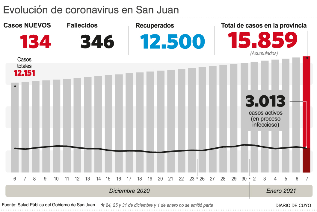 Si bien la curva de la evolución epidemiológica en San Juan sigue amesetada, lo cual es plausible frente a la cantidad de distritos argentinos en los que están estallando los contagios, ayer Salud Pública informó la muerte de 4 personas por Covid-19, índice que convirtió al jueves en la jornada más luctuosa en las últimas 10 en la provincia por la enfermedad.