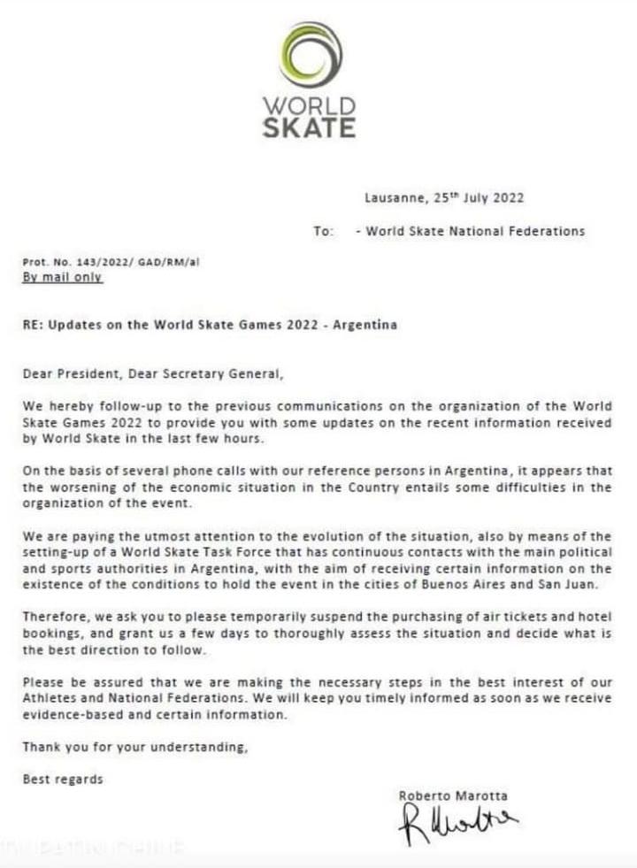 Hasta hace unas horas, el desarrollo de los World Skate Games 2022 estaba en duda luego de que se diera a conocer la carta que envió el secretario de la World Skate, Roberto Marotta, sobre la necesidad de poner un freno a la compra de los boletos de avión y reserva de hoteles por la crisis en Argentina.