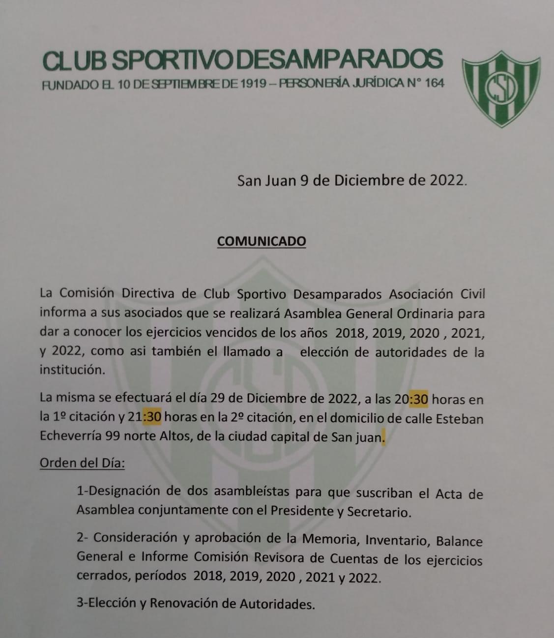 Lo cierto es que Sportivo convocó a sus socios para este jueves 29 a las 20.30 horas en primera citación y 21.30 en segunda citación. Allí se conocerán los balances de los años 2018. 2019, 2020, 2021 y el corriente año para después de la aprobación, elegir nuevas autoridades.