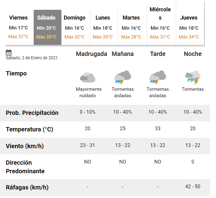 En cuanto al domingo, se prevé tormentas aisladas durante la madrugada y la mañana. Mientras que por la tarde estará parcialmente nublado. Para ese día se anuncian una temperatura mínima de 16 grados y una máxima de 32.
