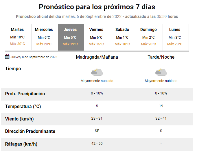 A partir de ahí cambiarán las condiciones. Durante la madrugada del jueves comenzará a soplar el viento Sur, que continuará durante la mañana con ráfagas de hasta 50 kilómetros por hora. Durante toda la jornada, el cielo estará mayormente nublado y la máxima llegará sólo a los 19 grados.