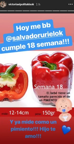 Vicky Xipolitakis transita la semana 18 de embarazo y compartió con sus seguidores la ecografía donde se nota a la perfección el rostro de Salvador Uriel. Muy contenta, la modelo mostró que, según una aplicación, el bebé mide entre 12 y 14 centímetros y pesa 150 gramos.