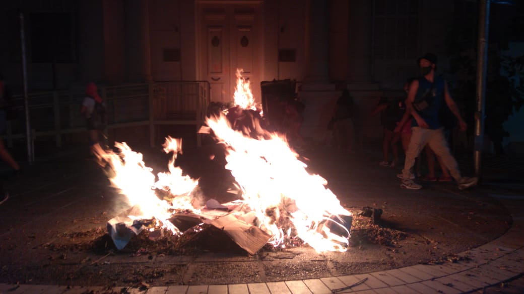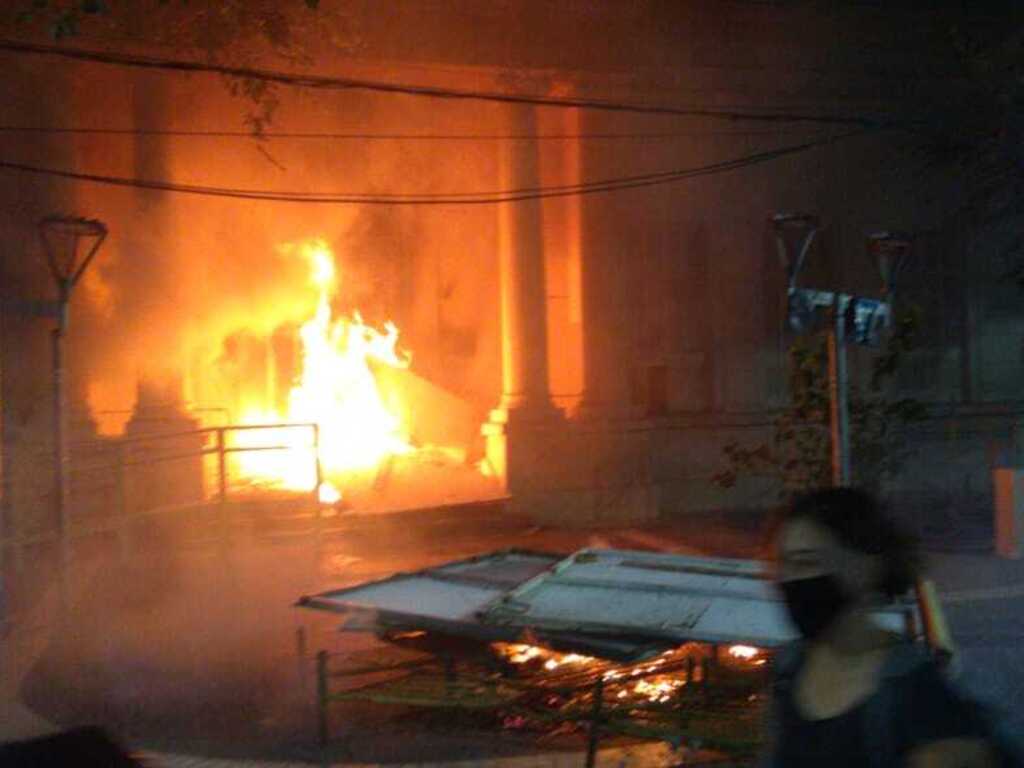 Alrededor de las 21, el mismo grupo que produjo los daños en el edificio de Virgen del Carmen de Cuyo, llegó hasta la Casa de las Leyes, en Peatonal y Patricias, y prendió fuego en el lugar.