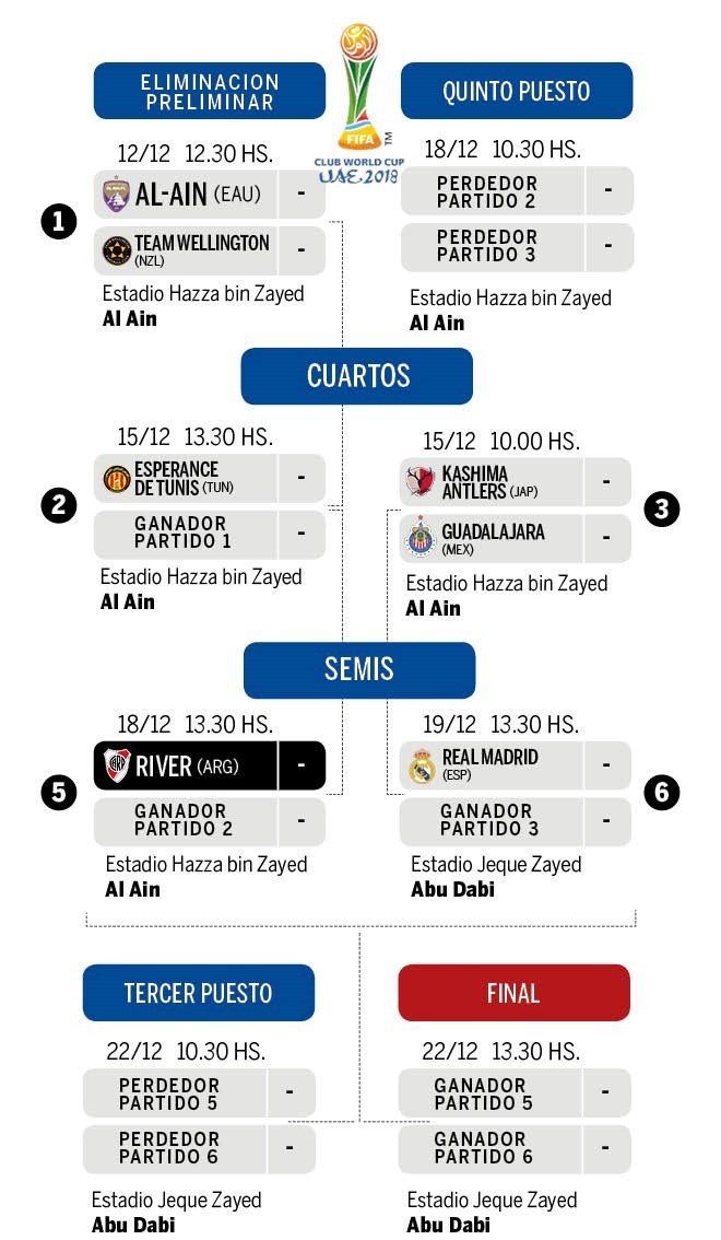 Gane o pierda, volverá a tener acción el sábado 22. Si es por el tercer puesto, será a las 10.30 y, si llega a la final, será a las 13.30. Real Madrid es el gran candidato por el otro lado de la llave, aunque también hay que mencionar a Kashima Antlers de Japón y Guadalajara de México. El estadio: Jeque Zayed de Abu Dabi.