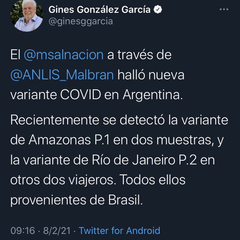 El Ministerio de Salud de la Nación, a través del Malbrán, detectó la variante de Amazonas P.1 en dos muestras, y la variante de Río de Janeiro P.2 en otros dos viajeros. Todos ellos provenientes de Brasil.