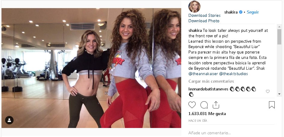 “Para parecer más alta hay que ponerse siempre en la primera fila de una foto. Esta lección sobre perspectiva básica la aprendí de Beyoncé rodando ‘Beautiful Liar’”, escribió la cantante junto a una fotografía en la que demuestra sus palabras a sus más de 56 millones de seguidores.