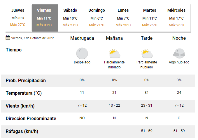 Cielo despejado por la mañana a parcialmente nublado por la tarde-noche. El viento arrancará del noroeste, cambiando al norte por la tarde y cerrando del oeste, con velocidades entre los 51 y 59 km/h.