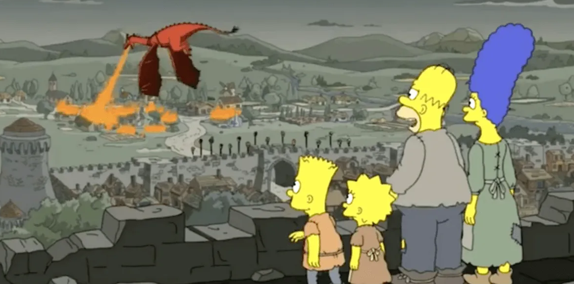 Parodiando a todo, Los Simpson llegaron a realizar su versión de la aclamada serie de HBO. En 2017, dos años antes de la octava y última temporada, el episodio tuvo a un dragón quemando un pueblo lleno de inocentes, igual que sucedería en el polémico final de la serie.