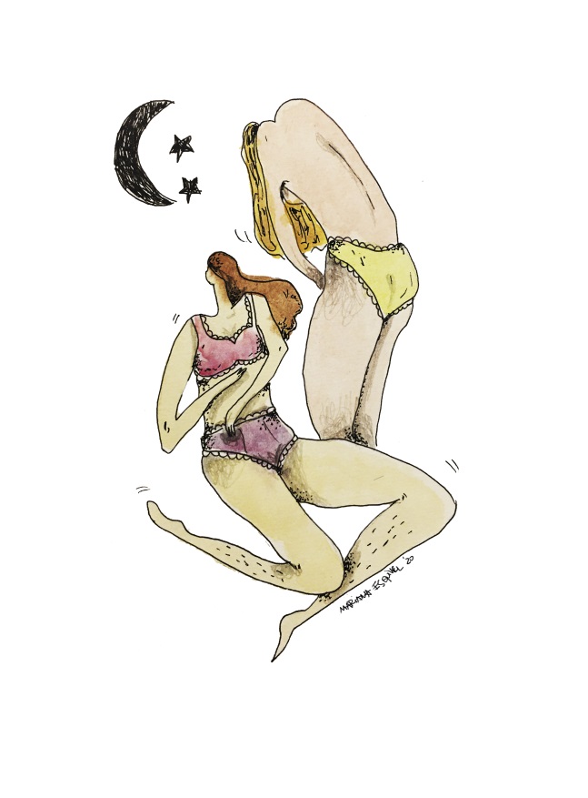 Varios encuentros virtuales sirvieron para que Tania le transmitiese a la creativa lo que quería: imágenes de mujeres como las de los figurines de moda, pero no tan estilizadas, sino cuerpos reales, con curvas y mucha femineidad. Pero además tenían que estar vestidas con las prendas que formarían parte de su colección primavera-verano 2020-2021. Y eso no es todo. Debían interactuar con las fases de la luna y con elementos de la naturaleza, que son fundantes en la vida de una mujer, según la visión de la propuesta. Mariana la escuchó. Y logró llevar al papel y las acuarelas el pedido.