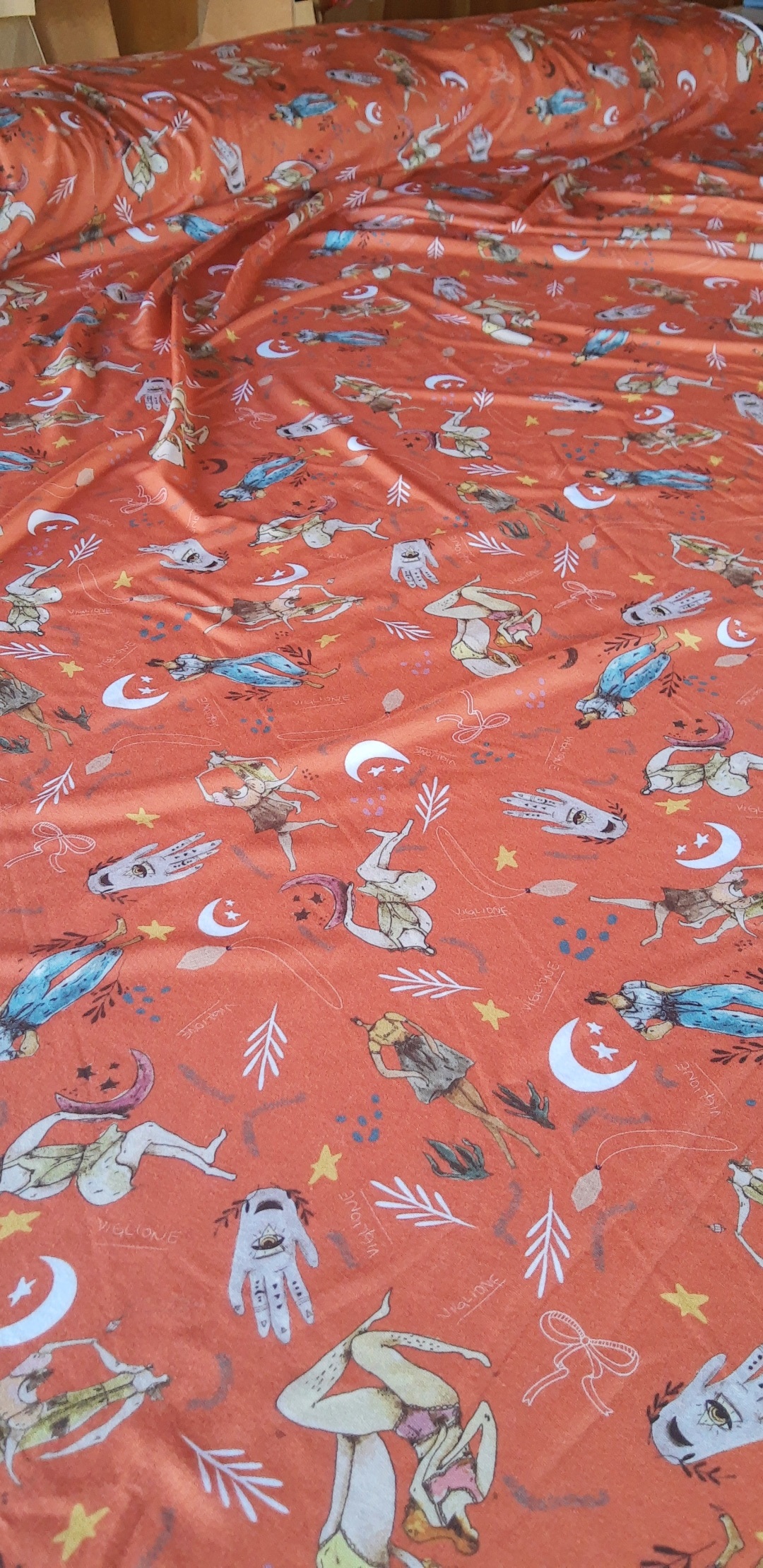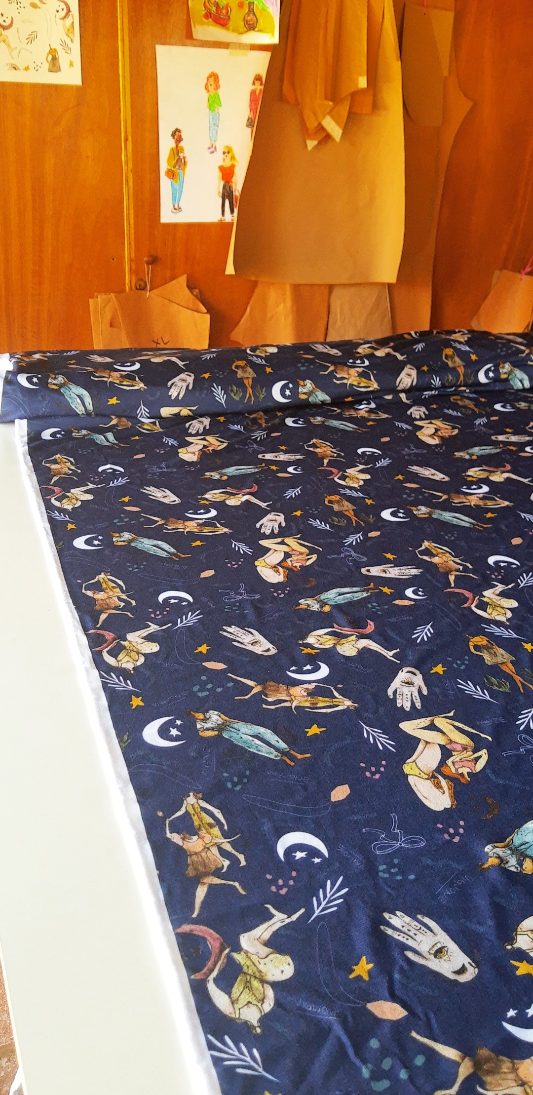 El proceso fue largo: más allá del paso a paso creativo, después le aplicó tecnología porque los digitalizó y en la computadora le agregó detalles como el nombre de la marca, además de imágenes de lunas, estrellas, moños, piedras, plantas. "Esa imagen pasó por fondos de varios colores hasta que decidimos que iba a quedar en rojo, blanco y azul. Después hicimos unas pruebas en papel y una vez que estuvo definido, mandamos el archivo a Buenos Aires para imprimir. Pero había un problema: yo no me animaba a estampar sin haber tocado antes la tela. Entonces un amigo me envió muestras de modal. Ahí recién di el visto bueno", cuenta el paso a paso hasta que la tela pasó por una máquina llamada calandra que transfiere por calor, la tinta de una lámina de papel al material textil. Si bien esa técnica se podía hacer en San Juan, solo imprime en pequeños trozos de tela. No hay equipamiento para hacerlo con un rollo entero que equivale a 60 metros de material, prácticamente la cantidad suficiente para armar la variedad de ropa de una colección.