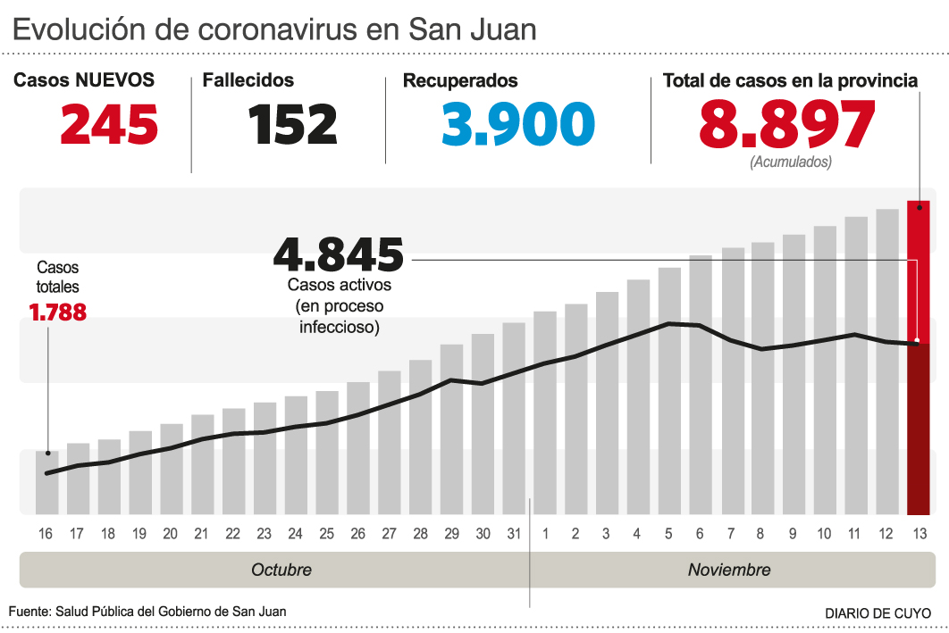 Salud Pública informó ayer seis nuevas muertes, la segunda marca más alta en 24 horas, y los decesos ahora suman 152. Ayer fallecieron cuatro hombres de 70; 62; 76 y 56 años y dos mujeres de 52 y 72. A su vez, confirmaron 245 casos y de esta manera los contagios ascienden a 8.897.