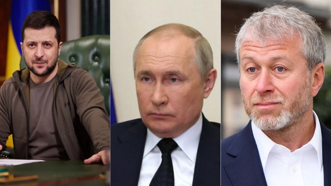De izquierda a derecha: el presidente de Ucrania, Volodimir Zelensky, el presidente de Rusia Vladimir Putin y el oligarca ruso y mediador, Roman Abramovich.