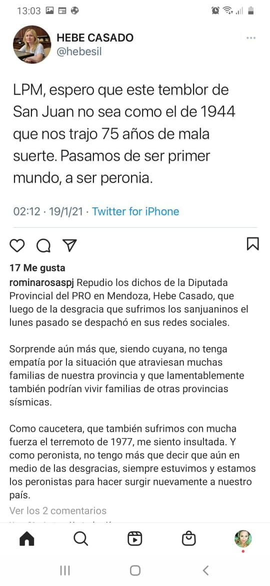 "LPM, espero que este temblor de San Juan no sea como el de 1944 que nos trajo 75 años de mala suerte. Pasamos de ser primer mundo, a ser peronia", escribió la mendocina Hebe Casado en su cuenta de Twitter, despertando indignación y aliados, casi de igual manera.