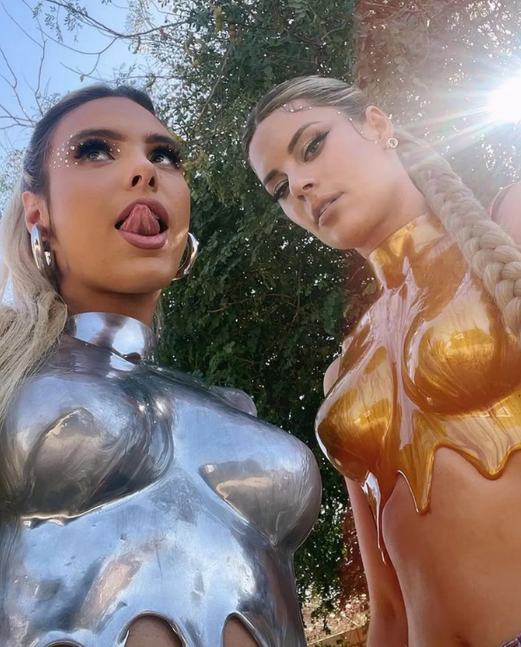La it girl posó acompañada de la modelo Hannah Stocking, que llevó el mismo top (conocido también como breastplate, que se traduce como coraza), pero en versión color oro. Además, ambas los combinaron con jugados minishorts denim muy ajustados y completaron las apuestas con botas metalizadas a juego con la prenda principal.