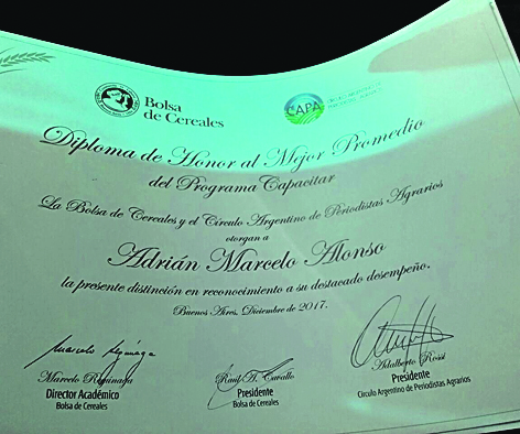 Nuestro compañero de Suplemento Verde desde hace muchos años, el licenciado Adrián Marcelo Alonso Sapia, fue distinguido en Buenos Aires esta semana con el Diploma de Honor al Mejor Promedio del Programa Capacitar, que se encuentra realizando a distancia en el 2017. El Círculo Argentino de Periodistas Agrarios y la Bolsa de Cereales otorgaron este diploma. Felicitaciones y a seguir en la senda de la comunicación de actividades cuyanas a nivel local, nacional e internacional.