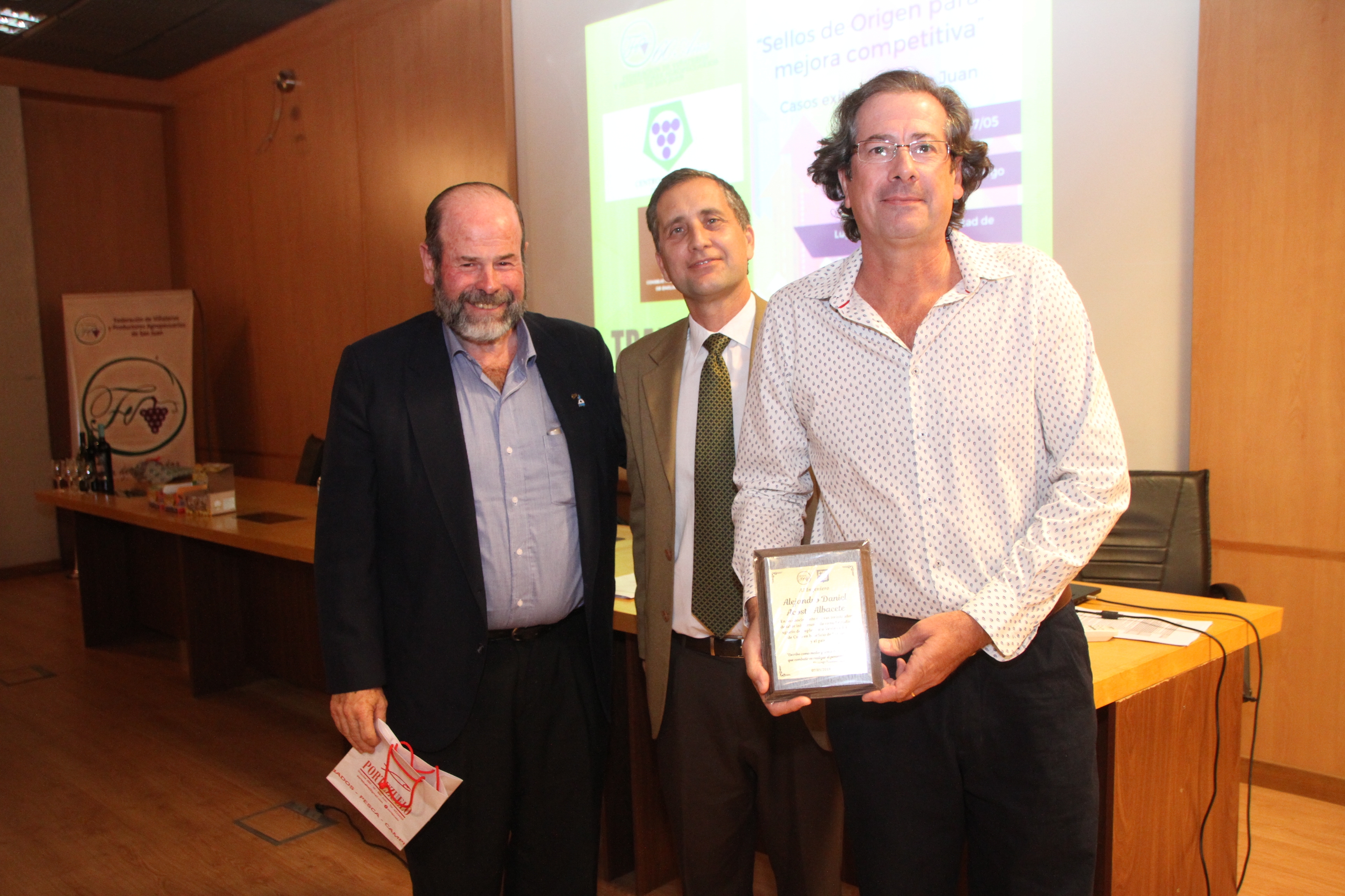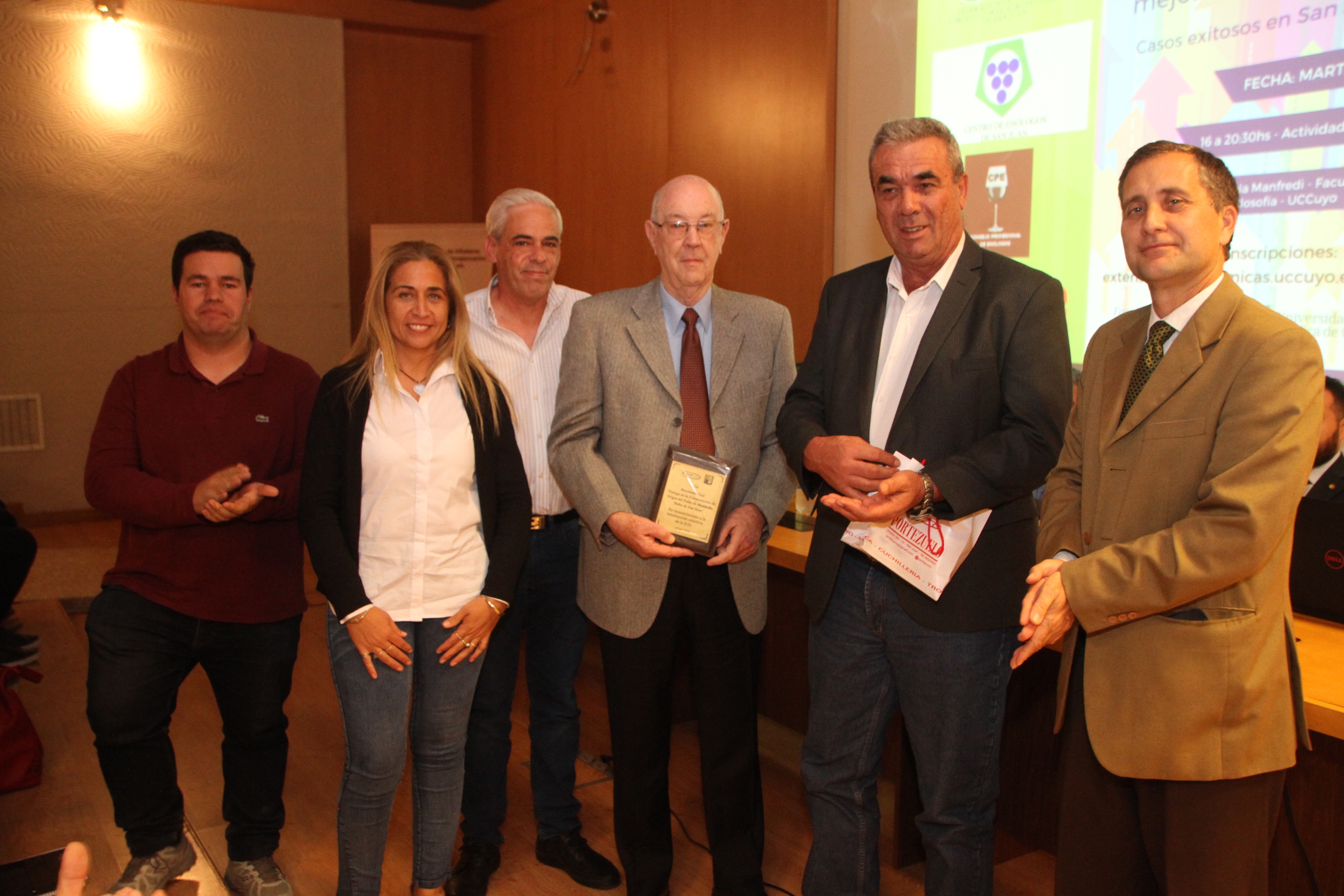 Finalmente, la Federación de Viñateros de San Juan y la UCCuyo entregaron plaquetas a los ingenieros agrónomos Alejandro Daniel Acosta y Hugo Daniel Carmona Torres, en reconocimiento por sus 30 años de labor ininterrumpida como periodistas agrarios de Suplemento Verde de DIARIO DE CUYO en beneficio de San Juan y el país. Horticultura, Viticultura, Fruticultura, exportaciones, investigación y desarrollo de tecnología, entre los ejes temáticos de la salida semanal. Vinculación público-privada y emprendimientos modelos, siempre presentes en la edición sabatina. La plaqueta recita, al final, la frase de Domingo Faustino Sarmiento: "Escribo como medio y arma de combate, que combatir es realizar el pensamiento". Entregaron Eduardo Garcés, presidente de la Federación de Viñateros de San Juan, y Leonardo Saball, decano de Ciencias Económicas de la UCCuyo.