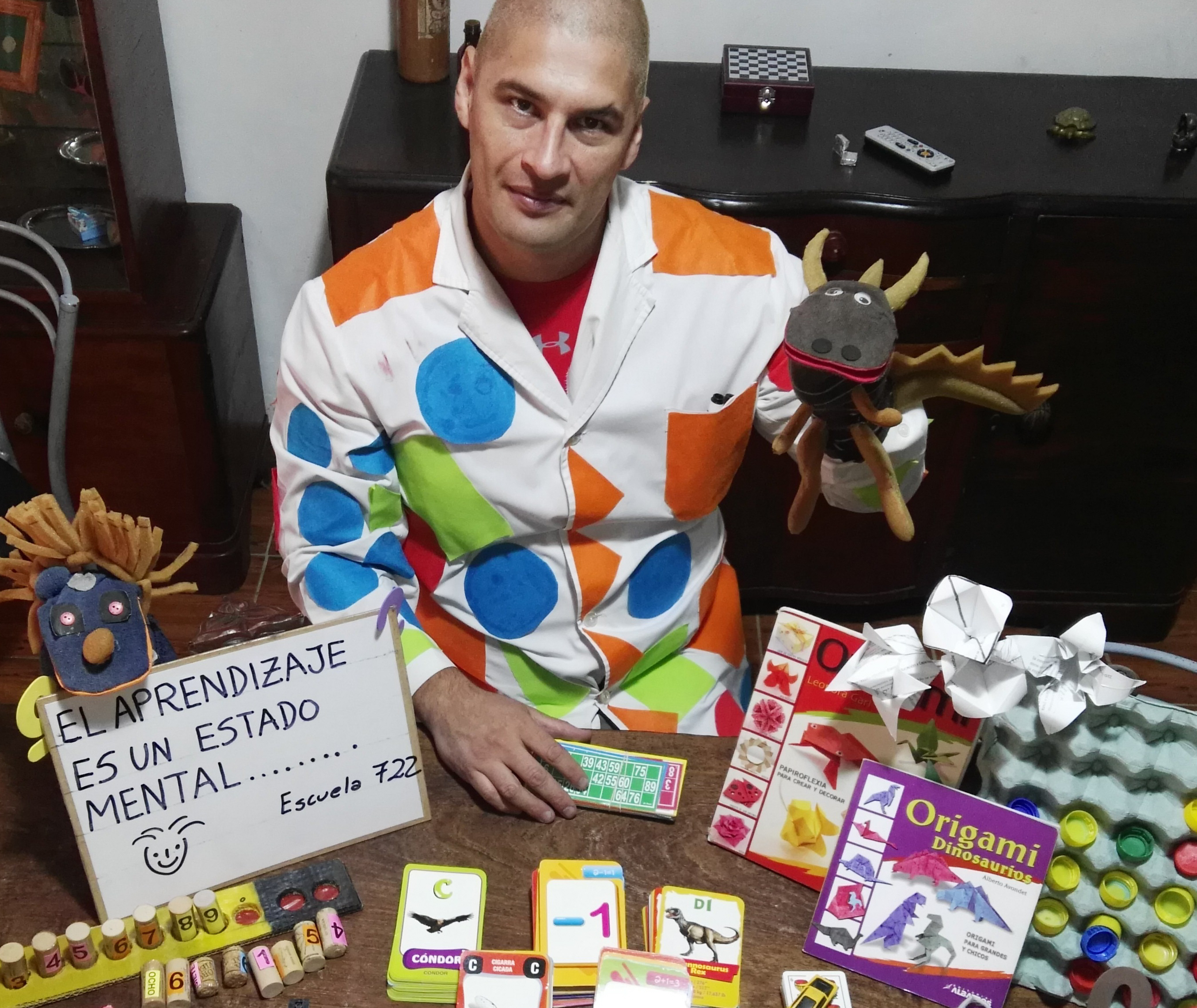 "Cuando repartí casa por casa las guías educativas a los niños y vi sus caritas a través de la ventana, me propuse que mis clases sean divertidas para ellos", contó Julio Arias, docente en la escuela Provincia de Formosa en Valle Fértil. Julio da clases a niños de primer grado y se le ocurrió comenzar a filmar videos cortos que manda por Whatsapp a sus alumnitos, todos con el contenido pedagógico que los chicos necesitan. "Le puse colores a mi guardapolvo, como un payaso, y enseño a los chicos a través del juego y aprovechando materiales reciclables como cartones de huevo y tapitas con las que pueden contar por ejemplo", comentó. Esa iniciativa la sumó a la planificación que hace para los niños de su escuela, pero por la repercusión, sus videos se compartieron a través de su directora, con los chicos de la escuela Presbítero Carlos Medina Suárez, una escuela ubicada en Baldes del Sur que queda a 30 km de la villa cabecera. "Los chicos me mandan foto de sus actividades y yo se las corrijo por Whatsapp. A veces busco horarios para enviar material, como a una familia que pone su teléfono a la noche debajo de un tarro para captar la señal de Wifi cercana porque no tienen para recargar datos", contó. La conectividad es un problema en la zona. Por eso sus videos no son de más un minuto y medio. "Son para motivarlos", cerró el docente.