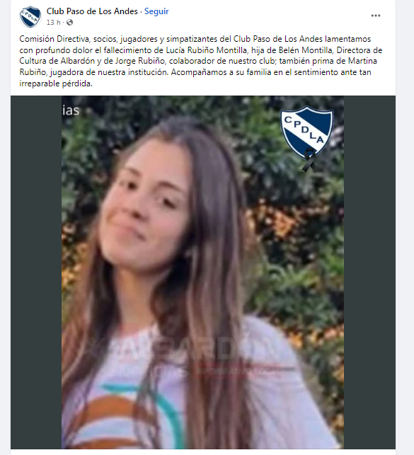 Luego de que se conociera la identidad de la joven que fue embestida el domingo en la madrugada, en el Barrio Profesionales, en Rivadavia, las redes sociales se llenaron de mensajes de dolor. Amigos, familiares e instituciones que conocían a Lucía Luján Rubiño Montilla (16) utilizaron las redes sociales para expresar su tristeza.