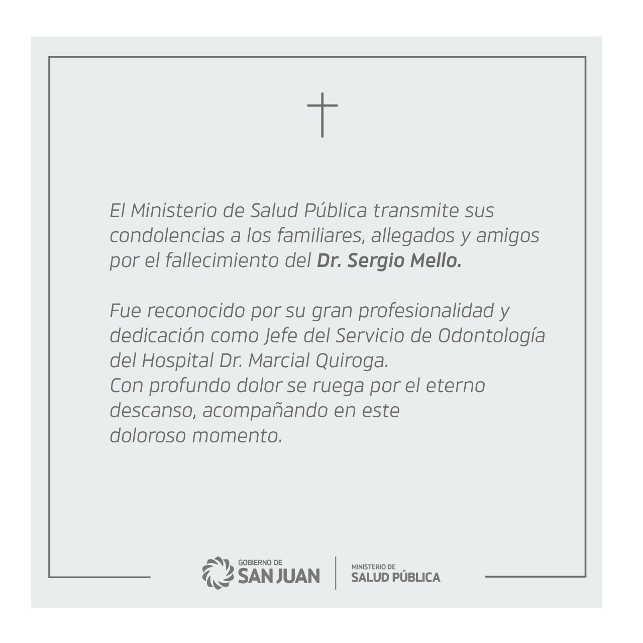 El fallecimiento de un reconocido odontólogo sanjuanino Sergio Mello genera dolor en diversos ámbitos en la provincia. El profesional murió en las últimas horas, luego de luchar contra el cáncer.