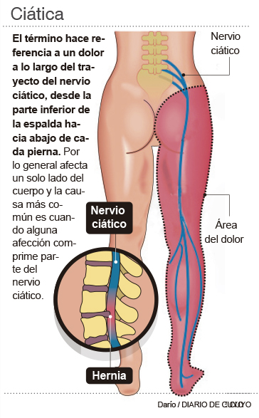 La ciática se caracteriza por dolores que se presentan a lo largo del nervio ciático. Se presenta con más frecuencia en el hombre que en la mujer, sobre todo entre los 40 y 50 años de edad. Prácticamente no existe en el niño. En la inmensa mayoría de los casos depende de afecciones en la columna vertebral, en especial por hernia de disco. A veces el dolor aparece en forma no muy definida. En otras ocasiones puede aparecer en forma aguda al realizar un esfuerzo, como levantar objetos pesados, al incorporarse la persona, al girar bruscamente sobre la cintura. El dolor se irradia desde la nalga hasta el pie, siguiendo el trayecto del nervio ciático. El dolor aumenta al sentarse en una superficie dura, al caminar o por enfriamiento. Suele disminuir en posición vertical u horizontal.