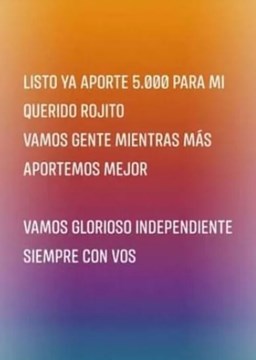 "Listo, ya aporté $5.000 para mi querido Rojito. Vamos gente, mientras más aportemos mejor. Vamos Gloriso Independiente, siempre con vos", escribió el joven en la red social y rápidamente llegó la respuesta de su ex.