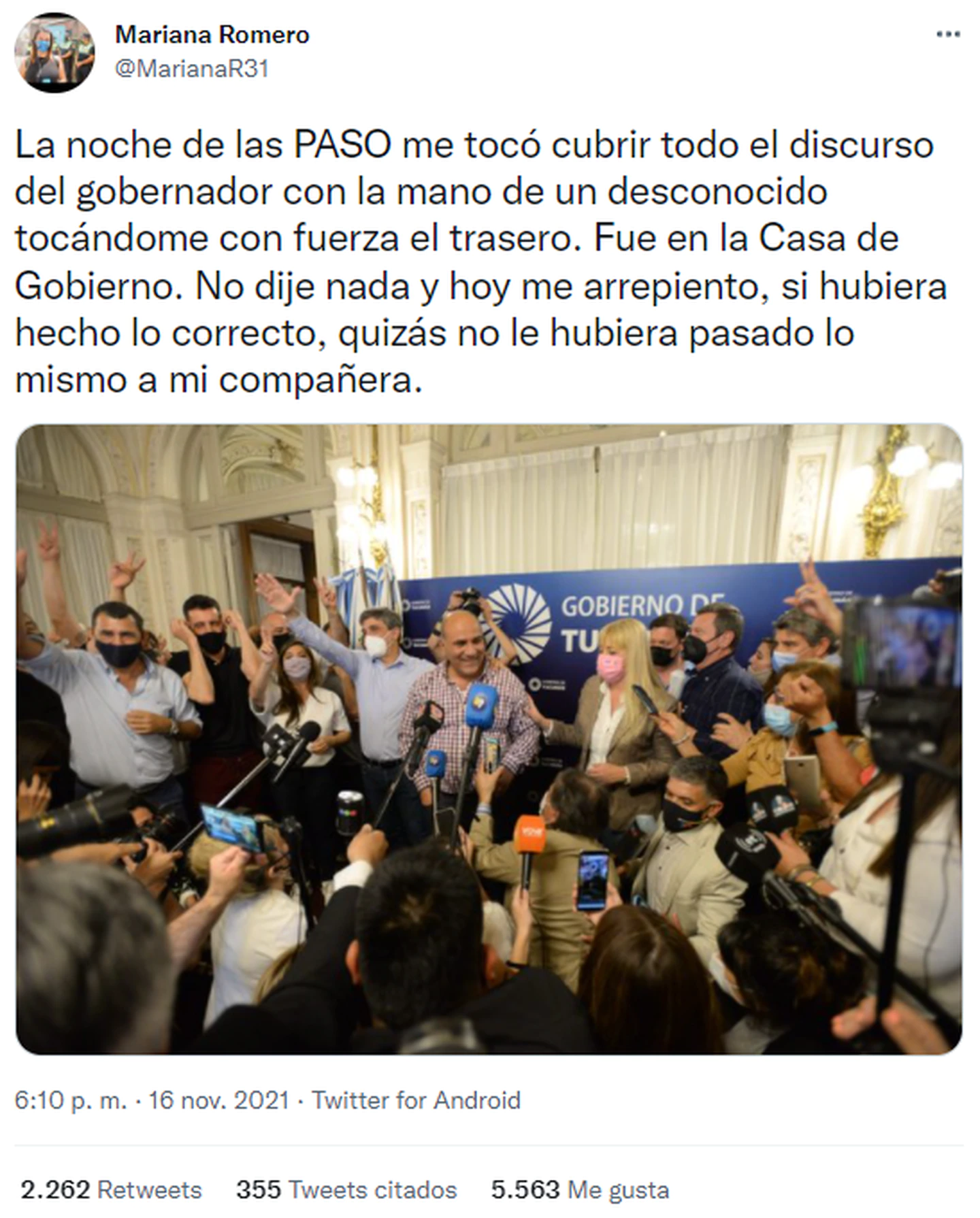 Romero hizo un descargo en sus redes sociales, en el que expresó su arrepentimiento por guardar silencio y no revelar el hecho del que fue víctima mientras brindaba declaraciones Juan Manzur, actual Jefe de Gabinete y por entonces gobernador de Tucumán.