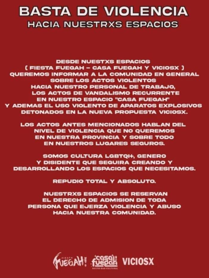 Por otro incidente en "Casa Fuegah" se viralizó un comunicado repudiendo ataques sucedidos en las últimas semanas. "Queremos informar a la comunidad sobre los actos violentos hacia nuestro personal de trabajo, lso actos de vandalismo recurrentes en nuestro espacio "Casa Fuegah" y además el uso violento de aparatos explosivos detonados en la nueva propuesta Viciosx. Los actos antes mencionados hablan del nivel de violencia que no queremos en nuestra provincia y sobre todo, en nuestros lugares seguros….repudio total y absoluto", publicaron en las redes sociales.