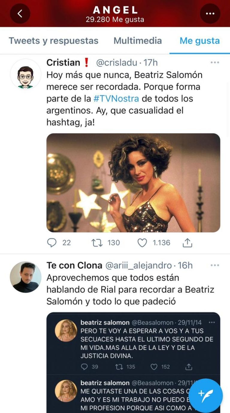Y si bien él no escribió nada, Ángel de Brito le dio ‘me gusta’ a muchos de esos posteos. "Hoy más que nunca, Beatriz Salomón merece ser recordada. Porque forma parte de la #TVNostra de todos los argentinos. Ay, que casualidad el hashtag, ja!", fue uno de los mensajes a los que le dio ‘like’.