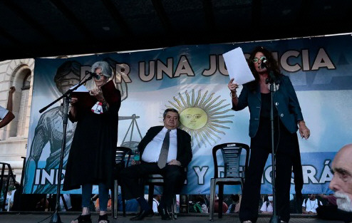 "Salimos a la calle para exigir que esta Corte se vaya. Para exigir el fin del Lawfare, las causas armadas", sostuvo el documento. "Esta Corte se tiene que ir porque permitió la sistemática persecución de los servicios de inteligencia y el Gobierno macrista", agrega el texto que leyeron Banegas y Kuliok.