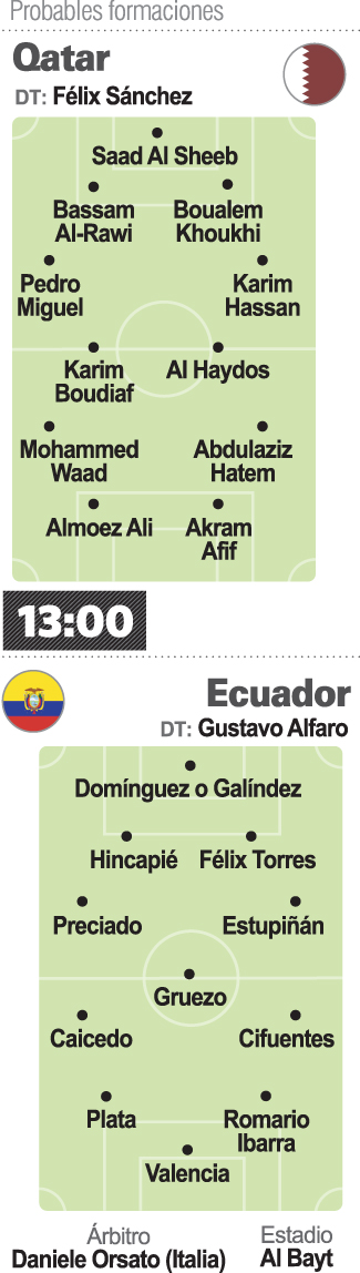 Qatar, país anfitrión y debutante en la Copa del Mundo 2022, y Ecuador, seleccionado conducido por el argentino Gustavo Alfaro, protagonizarán hoy el partido inaugural del torneo organizado por la FIFA.