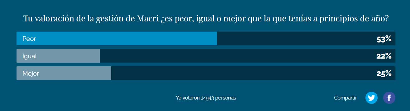 Para poco más de la mitad de los lectores que participaron de la encuesta de DIARIO DE CUYO,  la gestión del presidente Mauricio Macri empeoró en el último año.