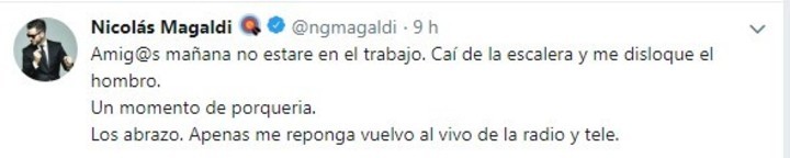 En detalle, el propio Nicolás anunció este martes a la noche en Twitter: "Amig@s mañana no estaré en el trabajo. Caí de la escalera y me disloqué el hombro. Un momento de porquería. Los abrazo. Apenas me reponga vuelvo al vivo de la radio y tele".