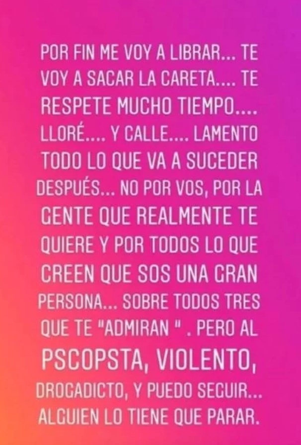 “Por fin me voy a librar. Te voy a sacar la careta. Te respeté mucho tiempo. Lloré y callé. Lamento todo lo que va a suceder después, no por vos, sino por toda la gente que realmente te quiere y por todos los que creen que sos una gran persona, sobre todo tres que te ‘admiran’”, decía el texto y terminaba en forma directa: “Pero al psicópata, violento, drogadicto, y puedo seguir, alguien lo tiene que parar”.