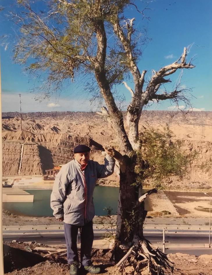 Este árbol ya crecido, estaba ubicado a la orilla del puente. Las máquinas que trabajaban haciendo limpieza y movimiento de suelo, lo arrancaron de raíces. En momentos que pasaba por la zona, se me ocurrió pedirle al maquinista que lo transportara con la pala cargadora arriba del cerro donde instalamos las oficinas. Previo a la excavación y relleno de tierra fue plantado; esto transcurrió a mediados del año 1974. El árbol, con nuestro cuidado, se adaptó perfectamente haciéndose importante.