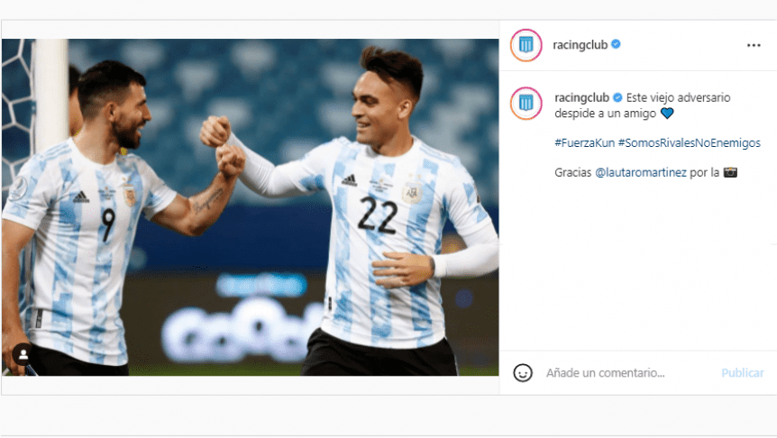 "Este viejo adversario despide a un amigo", escribió en sus redes sociales la Academia, compartiendo una foto del Kun y Lautaro Martínez -producto de las inferiores de Racing- con la camiseta de la Selección Argentina. Y acompañó el mensaje con los hashtags #FuerzaKun y #SomosRivalesNoEnemigos.