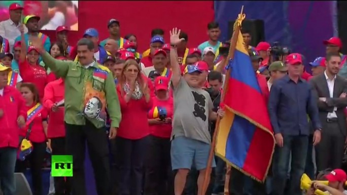 Maradona fue la atracción principal en el show previo al discurso del mandatario, en el que salió ondeando una bandera venezolana y bailando, causando la euforia de la multitud reunida para el acto. Junto al astro de fútbol había otras personalidades y artistas que visitan periódicamente Venezuela para expresar su respaldo al gobierno chavista.